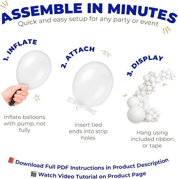 - 🛠️ Easy DIY Setup in Minutes. Create your balloon garland or arch quickly and easily with the included 16 ft balloon strip and a roll of glue dots. No special skills or tools needed—just inflate and decorate!