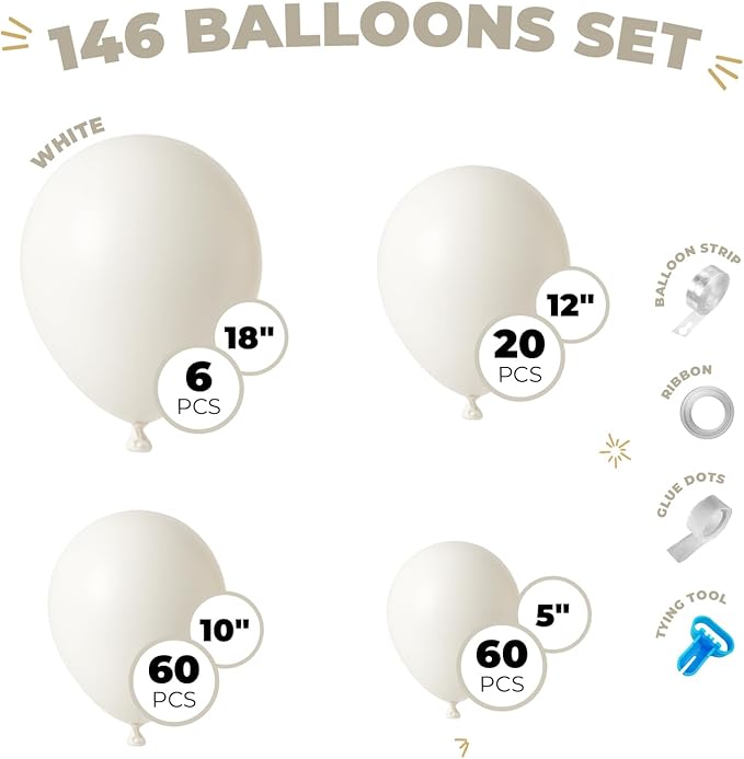 Balloon Garland Arch Kit – 146 Pcs White Balloons for Baby Shower, Birthday, Gender Reveal, Wedding Party – DIY Kit by Vellax™