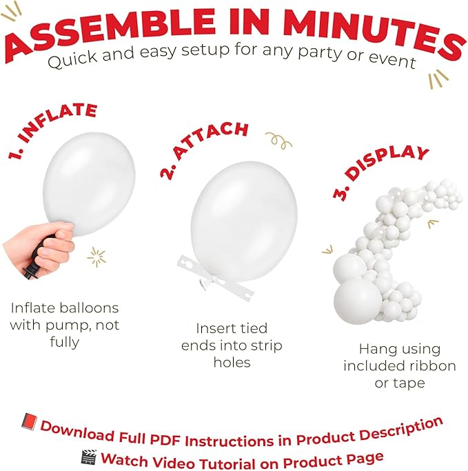 - 🛠️ Easy DIY Setup in Minutes. Create your balloon garland or arch quickly and easily with the included 16 ft balloon strip and a roll of glue dots. No special skills or tools needed—just inflate and decorate!