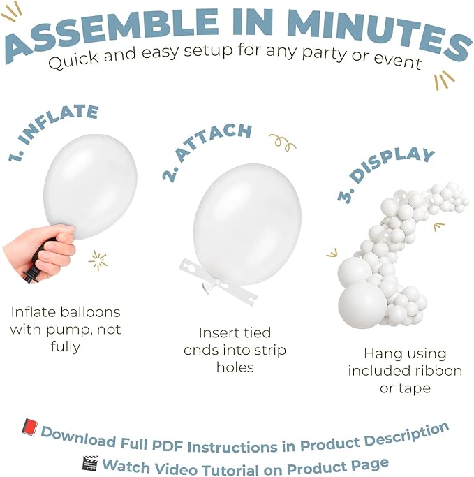 - 🛠️ Easy DIY Setup in Minutes. Create your balloon garland or arch quickly and easily with the included 16 ft balloon strip and a roll of glue dots. No special skills or tools needed—just inflate and decorate!
