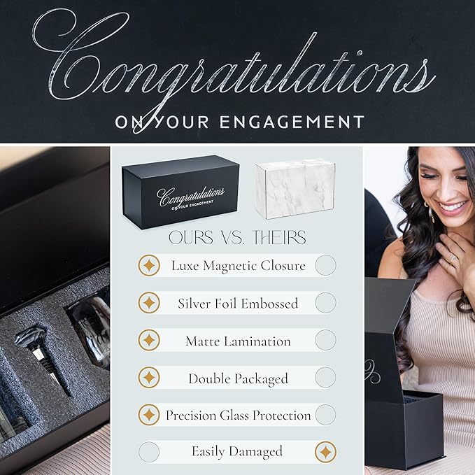 - NEED A FAST ENGAGEMENT GIFT FOR COUPLE? Skip the wrapping and head to any christmas or engagement party with a ready-to-give gift! Double packaged in a dent-proof outer box, we've ensured your engagement gift couple glasses and giftbox arrive in tact. We guarantee it! If anything happens to your engagement gifts for couple, we offer a full-time warranty to cover it fast!
