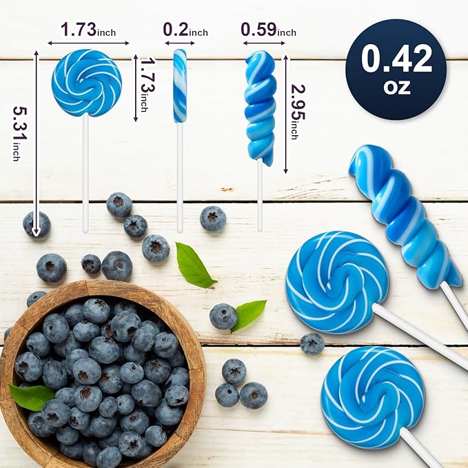 - Classic Blueberry Flavor in Two Fun Forms: Indulge in the sweet and tangy taste of natural blueberry with our delicious lollipops. This unique assortment offers the best of both worlds, featuring 16 classic round swirl lollipops and 16 playful spiral sticks, providing a delightful visual and tasting experience.