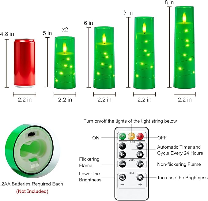 - 【Package Include】: This remote candle set consists of 5 candles (D2.3" x H5" 5"/ 6" / 7“/ 8“), an 11-button remote control, and a manual. Each flameless candle is powered by 2 AA batteries (not included), providing the ultimate flexibility in placement.