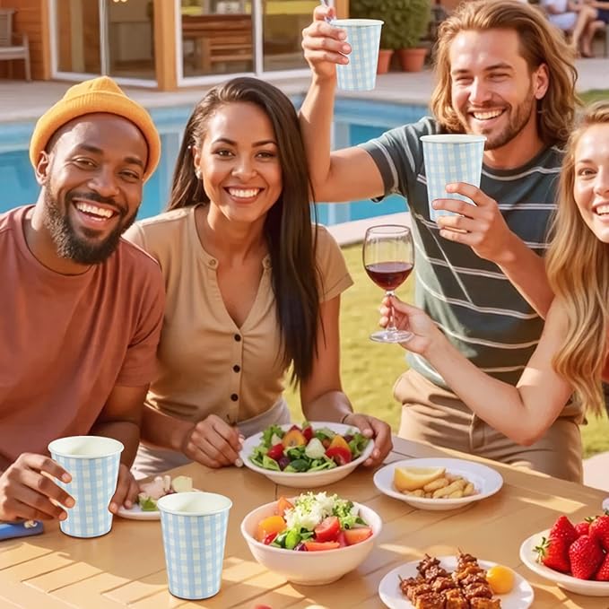 50 Pieces 8 oz Gingham Paper Cups, Disposable Gingham Cups, Checkered Cup for Hot Cold Beverage Birthday Party Supplies Decorations (Blue)