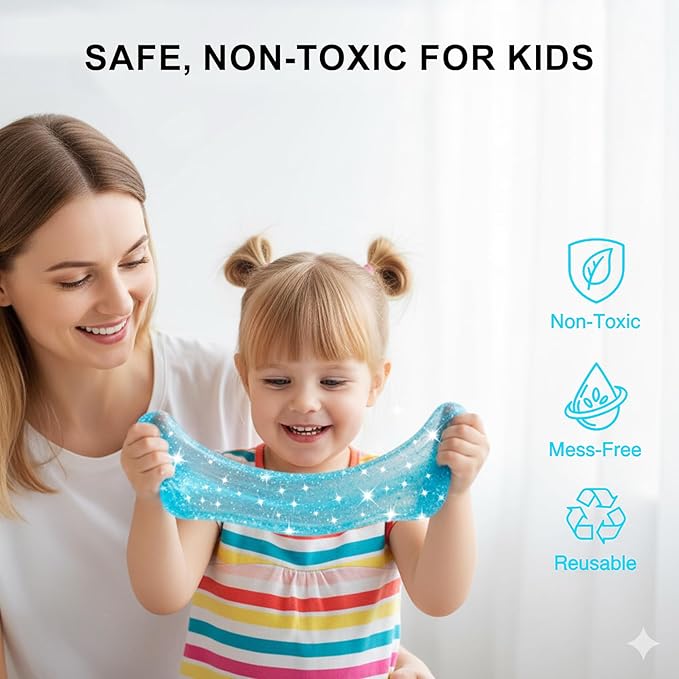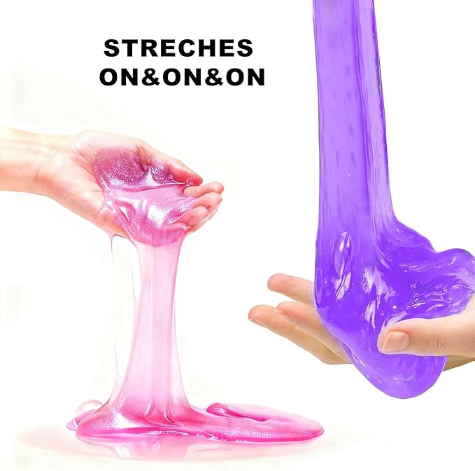 - Safe, Non-Toxic & Easy to Clean: Made with eco-friendly materials, ASTM and CPSIA certified, Our clear slime kit is 100% safe for kids aged 4 and up. It's super stretchy and soft but won't stick to hands, clothes, or furniture, providing a mess-free sensory play experience