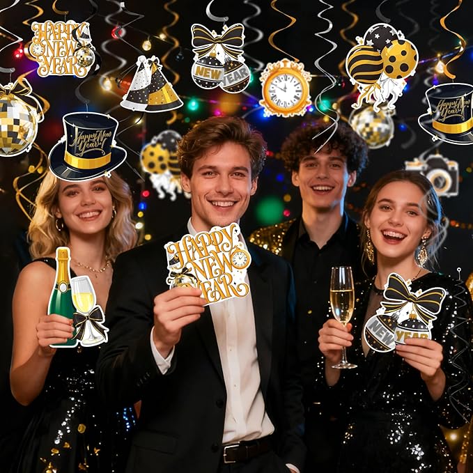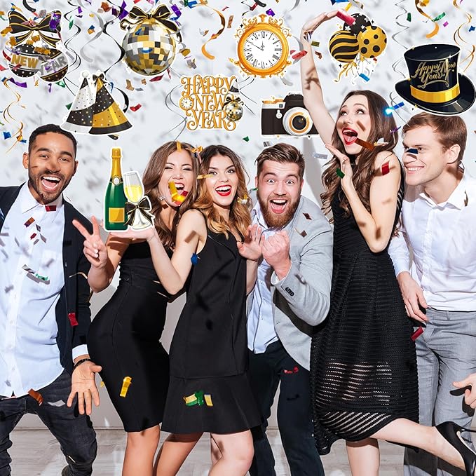 - Transform any space into a festive wonderland with our versatile New Year's decorations. Ideal for New Year parties, theme parties, classroom decor, and winter-themed events, these foil swirls and hanging decorations bring festive flair to any celebration.