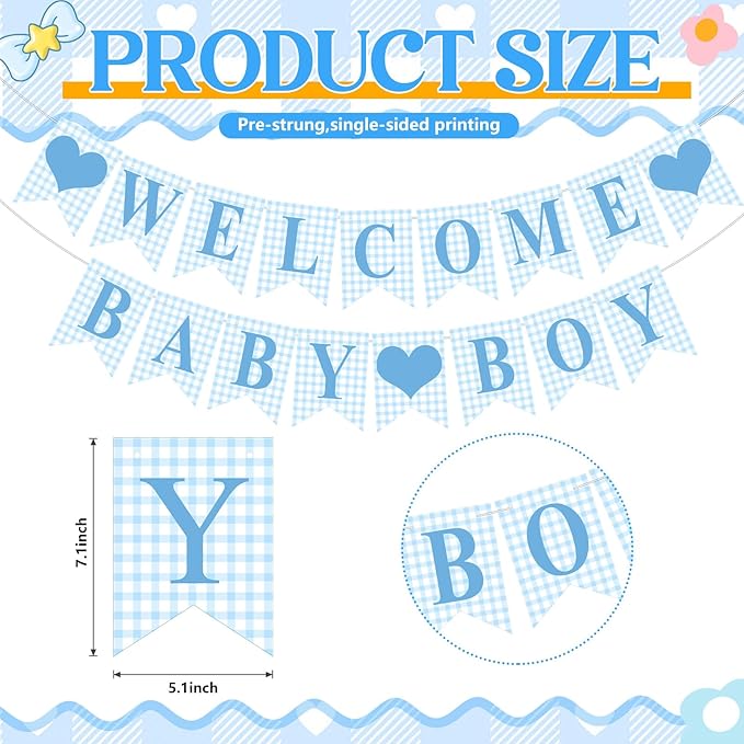 - Packing List: you will receive a preassembled welcome baby boy banner, no need for any additional assembly; Blue gingham baby shower banner comes ready to hang; The banner features a charming blue plaid design with a classic light blue checkered pattern, adding a sweet and timeless touch to any party, adding a sophisticated and warm touch; It's suitable for all indoor and outdoor party settings