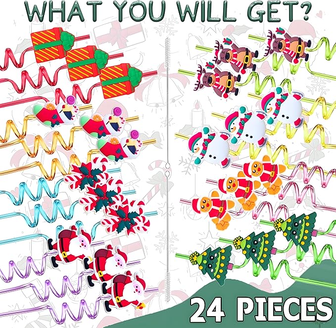 - đăDual-Themed Party Value PackăThis exclusive bundle includes 24 Christmas-themed straws with festive designs (Santa, snowmen, reindeer) and 24 snowflake-themed straws with glittery detachable toppers. Perfect for combining holiday celebrations, winter parties, and seasonal events, this set offers double the fun and versatility. Ideal for Christmas gatherings, frozen birthday parties, and New Year's festivities, it provides a complete solution for all your decorative and functional needs.