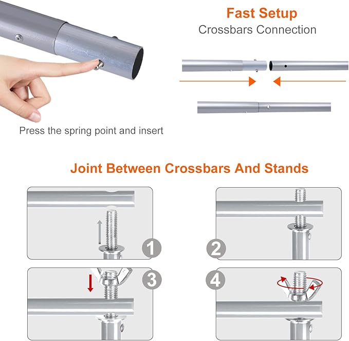 - 【Effortless Installation】Without additional tools to set up the stand. Each joint of the crossbars features spring points, allowing for simple assembly by pressing and inserting them into another crossbar.If you think it's not sturdy as you expected, you can put sand bags or little heavy thing on the legs, maybe it will be better and more stable.(Outside)