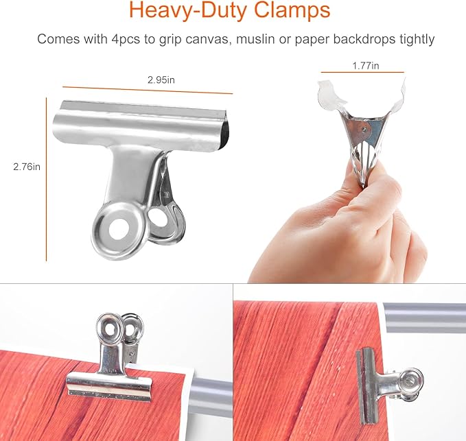- 【Adjustable lightweight Stand】 To ensure a seamless appearance, the backdrop stand includes four heavy-duty clamps that tightly grip canvas, muslin, or paper backdrops, effectively preventing wrinkles. The four durable crossbars offer stability and can be supplemented with extra weights for outdoor use.